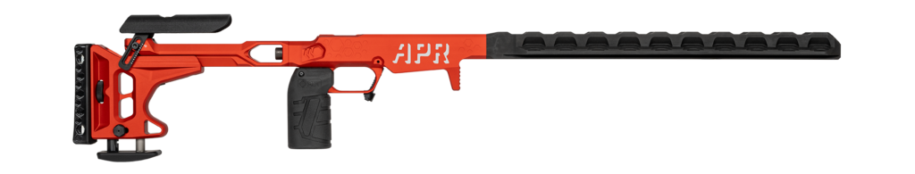 Le châssis est usiné dans un aluminium de qualité aéronautique, avec anodisation rouge résistante à l’abrasion. Le garde main “Heavy Forend” en acier offre une inertie supplémentaire pour minimiser le relèvement lors du tir. Grâce aux interfaces ARCA-Swiss et M-LOK, la carabine peut être configurée avec des appuis avant, poignées, bipieds ou sacs PRS. La crosse est ajustable (longueur et appui joue), pour une adaptation parfaite à chaque tireur.